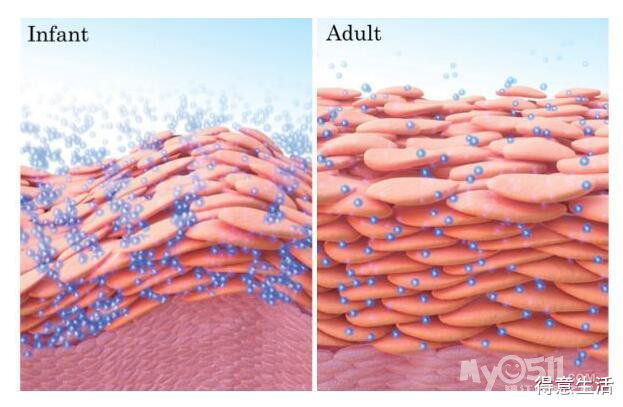 由于婴儿皮肤水分吸收和丢失的速度都大于成人,皮肤角质层水分“进得快、出得快”是婴儿皮肤屏障的重要特点(图1),也因为这个功能的差异,导致婴儿皮肤屏障暂时不完善,因此对于婴儿护肤品选择,也需要慎重,涂抹于婴儿皮肤上的物质可能更容易被吸收,发生刺激或过敏反应的几率也更高。