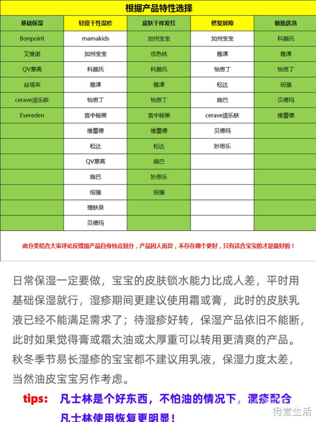 正是因为婴儿皮肤的脆弱性,所以我们在选择保湿产品时需要花更多的时间和心思;先来说说保湿产品的使用问题,不管你是用的哪种保湿产品,在确保安全的情况下,湿疹期间保持3-5次甚至更多次数的涂抹,原因不解释了,上面已经解释过了;尤其湿疹部位,更是要多次足量的补涂,湿疹期间更建议使用霜或膏,此时的皮肤乳液已经不能满足需求了;待湿疹好转,保湿产品依旧不能断,此时如果觉得膏或霜太油或太厚重可以转用更清爽的产品。秋冬季节易长湿疹的宝宝都不建议用乳液,保湿力度太差,当然油皮宝宝另作考虑。