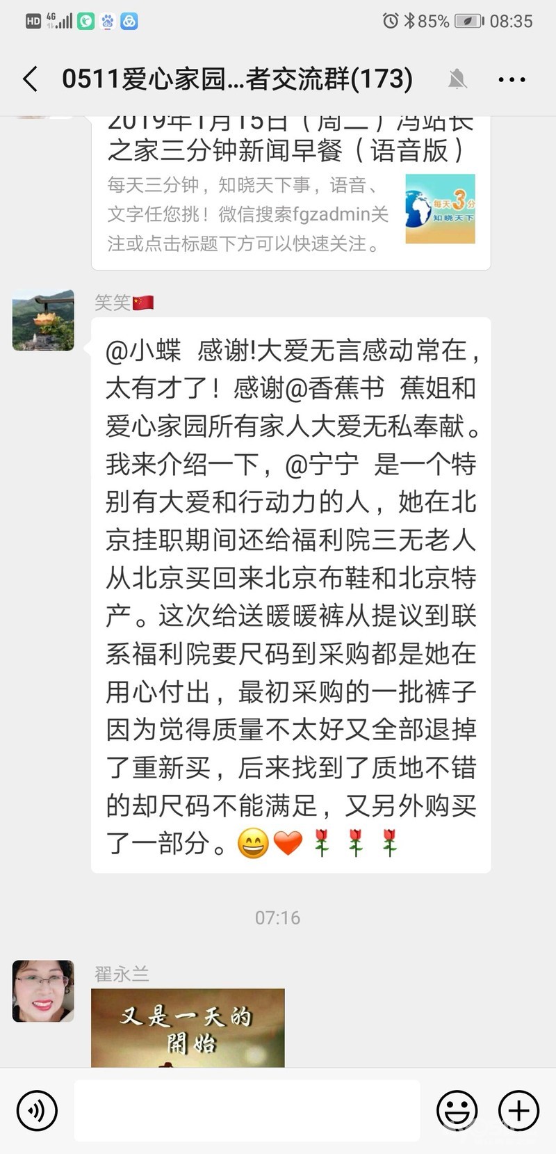 今有暖阳,心已融化。牵挂姐姐说:蝶,明天中午我们去福利院义务理发你来吧。理发时短,多久未见家园的兄弟姐妹们了,想你们了,我来。十二点多来到福利院,还没下车就见到前方三人,红色园服在暖阳下格外醒目。蕉蕉!热血沸腾起来,好亲切刚走到前面,又见家园资深爱心志愿者笑笑和宁宁,她俩人每年都会为这里的老人们购买物品。看,这车里一盒盒的暖暖裤40条,就是今天她俩人为老人们精心准备的礼物。放下物品,只看到她俩匆忙离去背影,是那么的美 来到理发的楼下,远远的见到我所敬佩的牵挂姐姐,她和其他姐妹们在忙着下车里的四大箱,原来是一爱心人士捐赠的尿不湿,给康复中心的三无人们。大爱无言,爱无价。