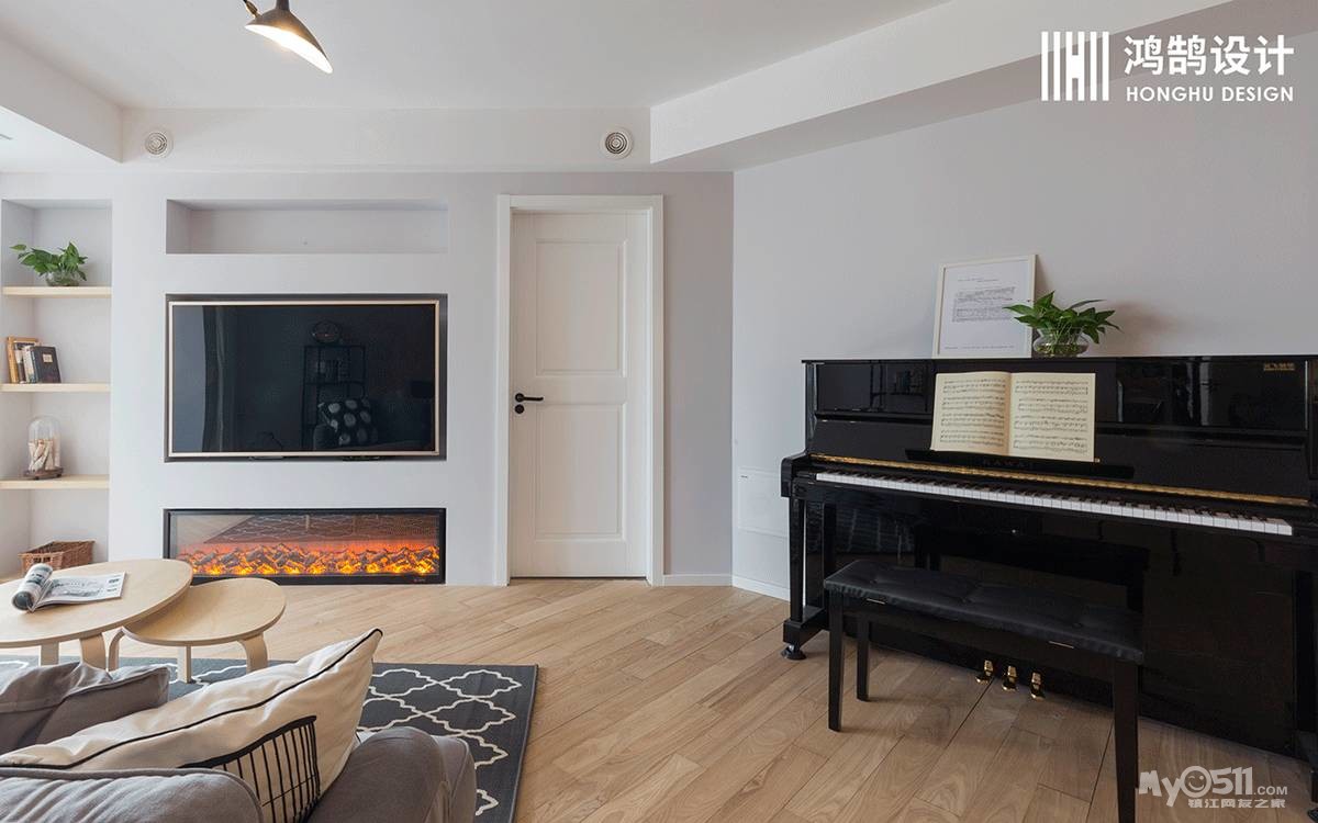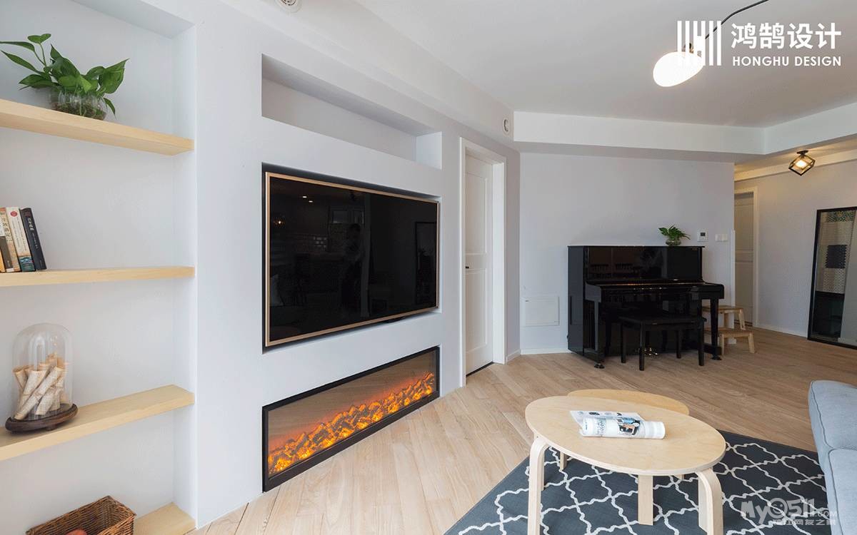 入墙式的电视背景搭配仿真电子壁炉,电视旁的层板可以置物一些书籍及装饰品。