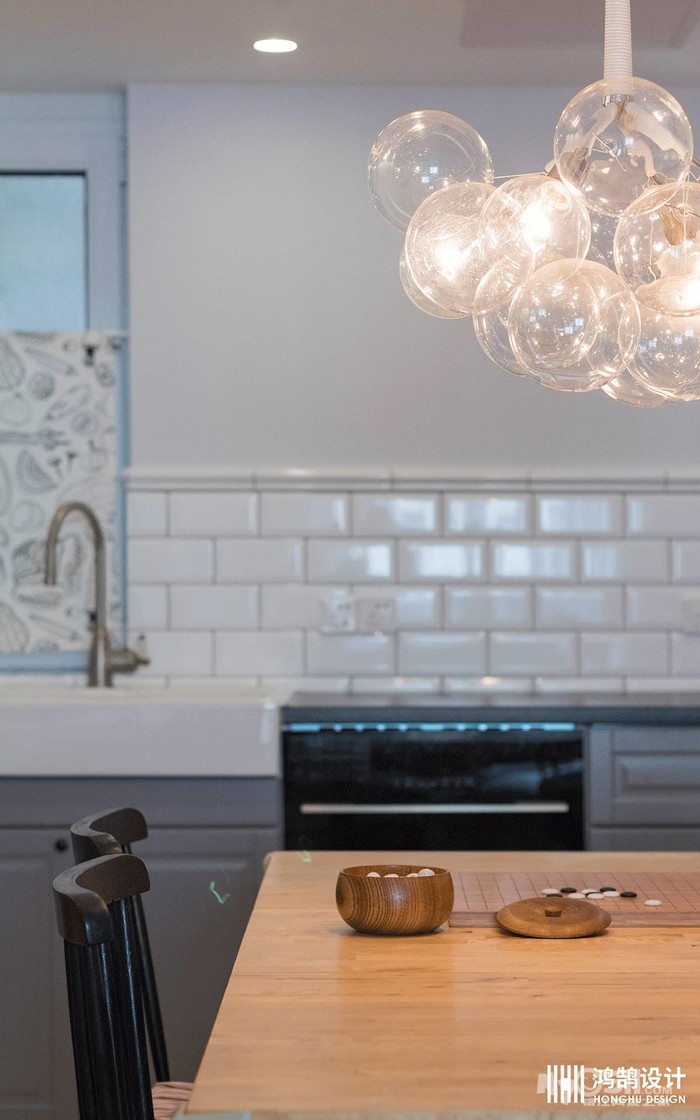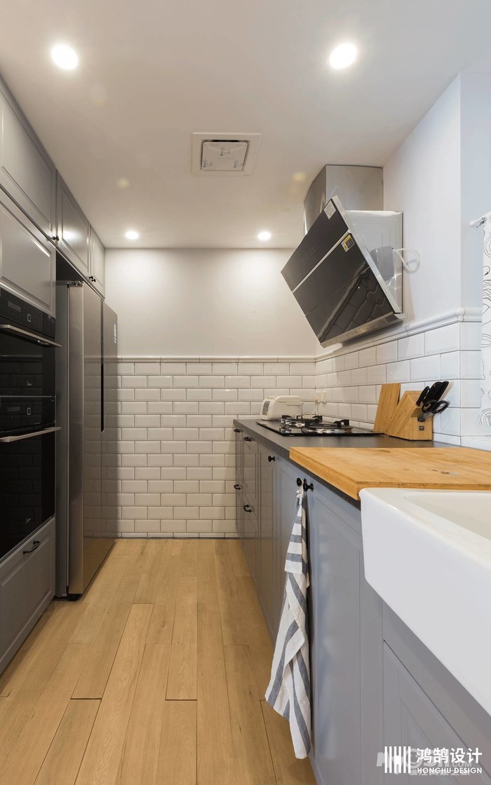 小白砖铺贴半墙搭配灰色的橱柜,家电嵌入式设计,空间收纳井井有条。