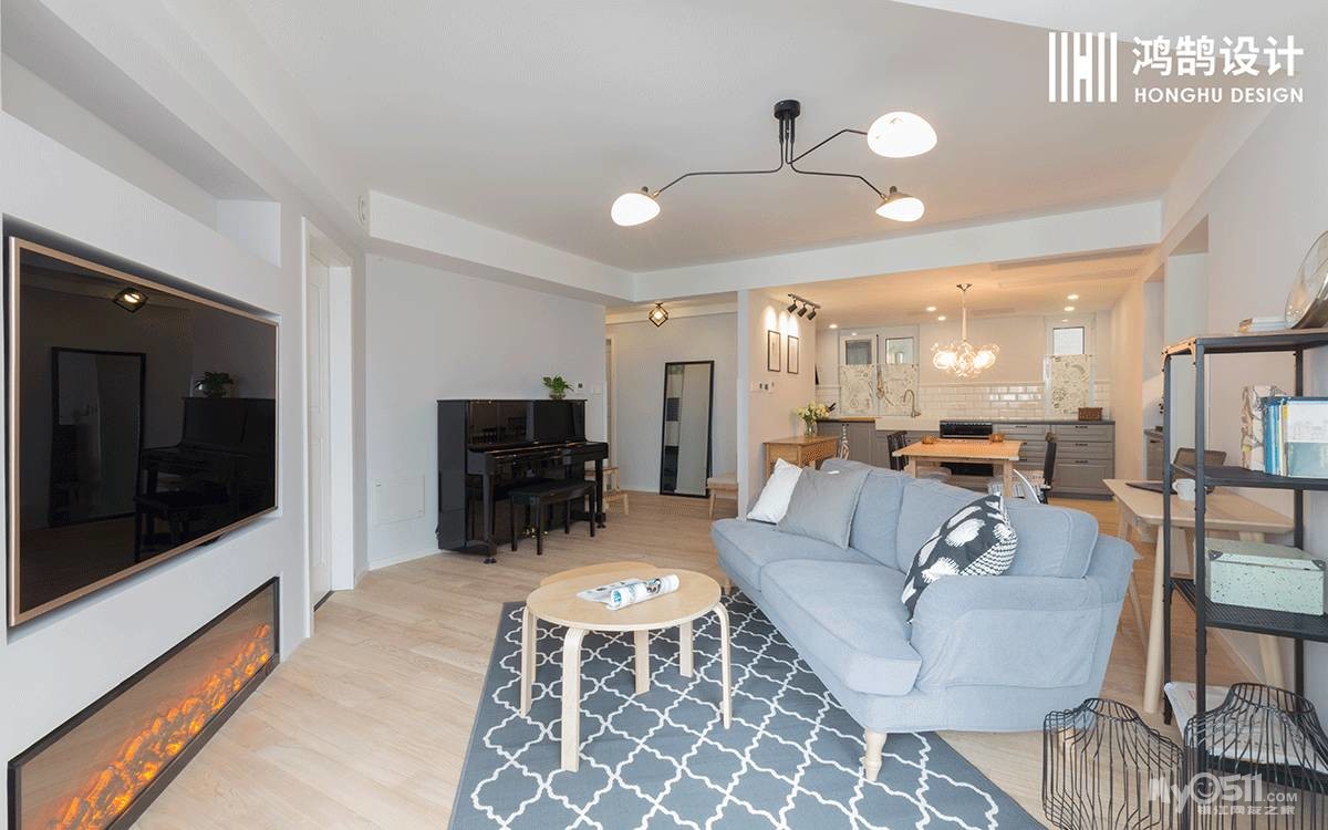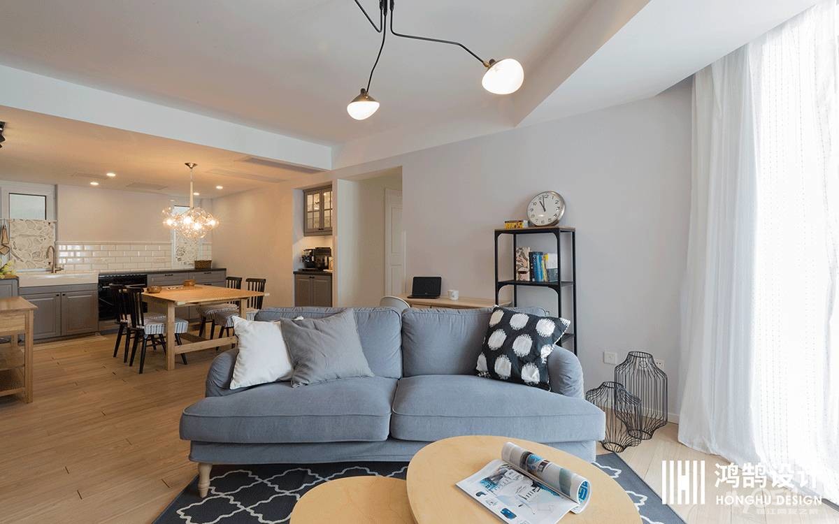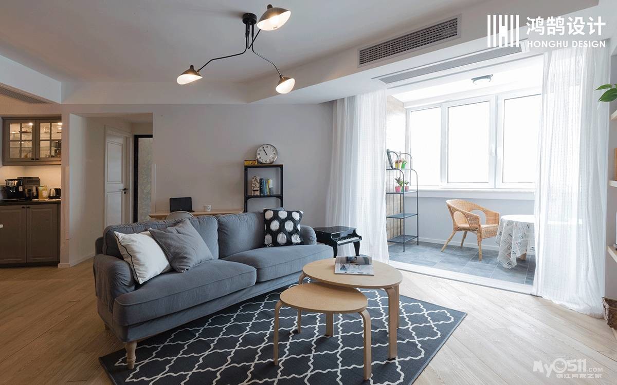 客餐厅实木地板通铺,灰色布艺沙发、黑白图案的地毯搭配原木子母茶几,清爽简洁又颇有质感,沙发背后靠墙放置一张小书桌,作为学习区域,增加了一个功能区。