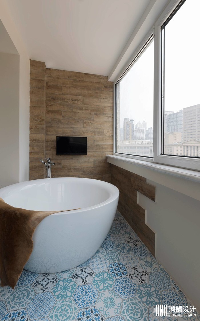 阳台设置独立浴缸,色彩斑斓的地砖个性十足,晒着太阳泡着澡,生活本该如此惬意。