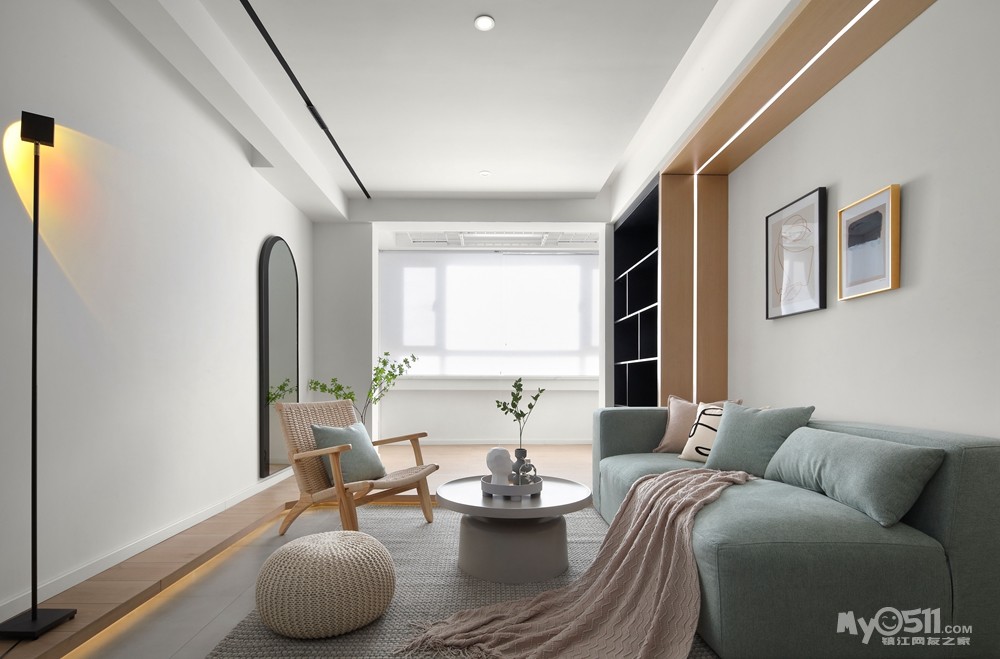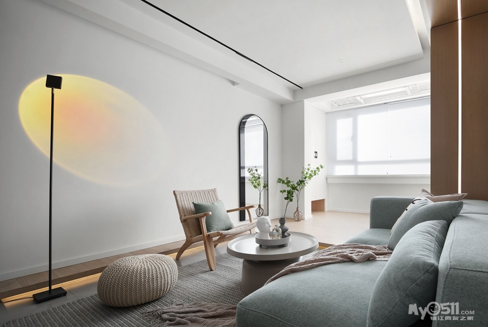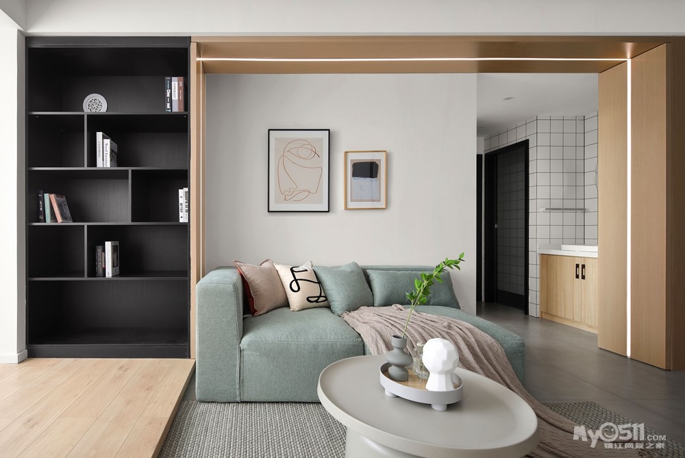 次卧的门做隐形门,墙面墙板和沙发区的U型连接,延伸感和体块增加空间的趣味性 地面的哑光仿古砖性价比很高。