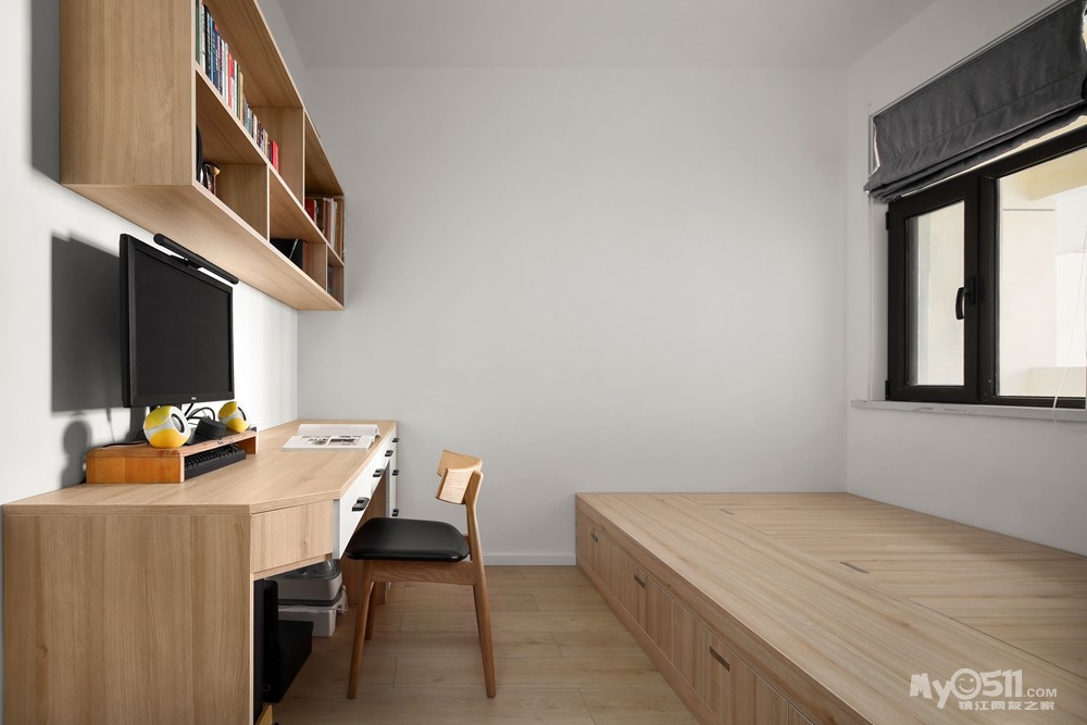 书房则做了榻榻米,父母来了可以住,1.7米的大书桌,满足业主在家办公的功能。