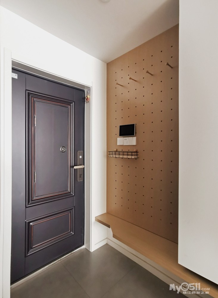 门口做了洞洞板与鞋柜相连,木饰面定制换鞋的台子,下面可以放置日常的鞋子,入户的板支撑架暗藏在下面。