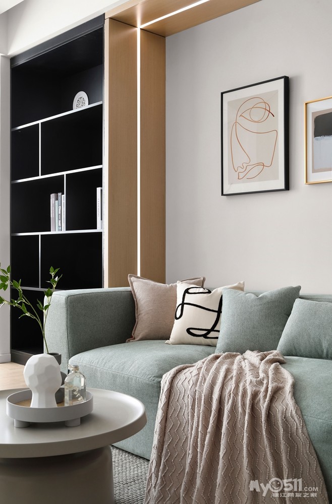 地台连接了顶面做了U字型的木饰面,内嵌线型灯带划分了区域,又很有趣味性,地台上面的小书架美观且收纳强大。