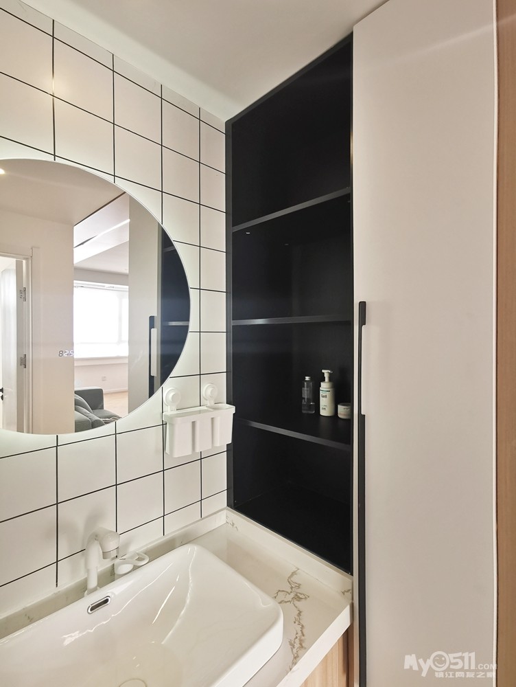面池变放置日常使用瓶瓶罐罐,洗脸巾等,右边的柜子可以收纳囤货的牙膏和纸巾等。