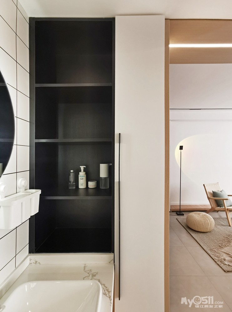 木地板和哑光瓷砖的区分增加层次感,暗藏的灯带晚上可以做氛围灯。