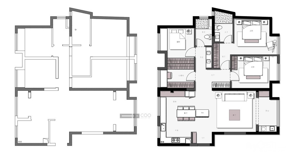本案原户型厨房餐厅空间相对较小,入户进门直接面对卫生间,所以我们选择将厨房打开与餐厅融合做成开放式厨房,结合岛台设计了玄关,挡住视线,保护居住隐私性。同时,针对过道太长难以利用以及主卧原有的衣帽间过小的问题,我们选择将原有过道区域一部分融入房间做成衣柜,另一部分做成客卫干区,提升了空间的利用率。