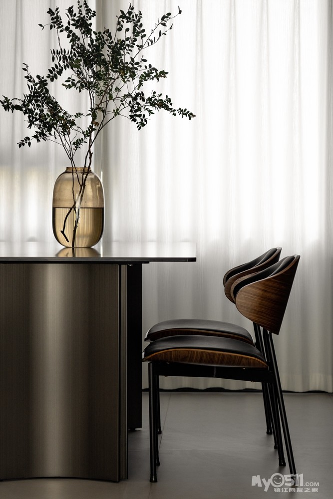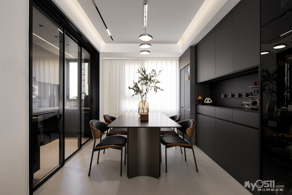 与客厅相连,形成开放式空间,增强空间的通透感。餐桌现代化的岩板餐桌,搭配造型简约的餐椅。上方悬挂造型独特的吊灯,为用餐增添氛围。餐边柜采用深棕色,增加收纳功能的同时,也提升了空间的美观度。