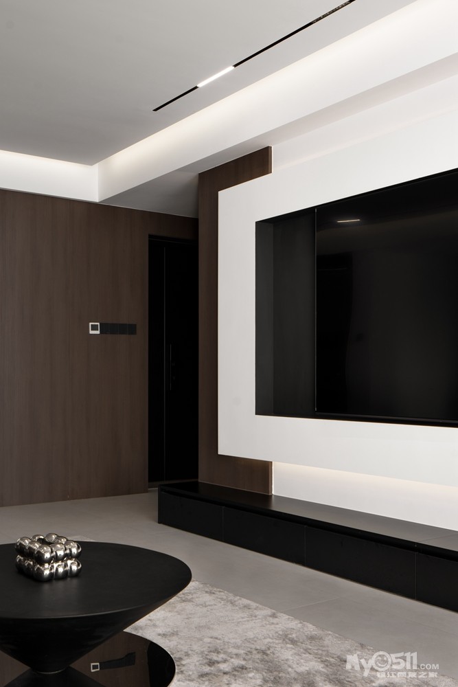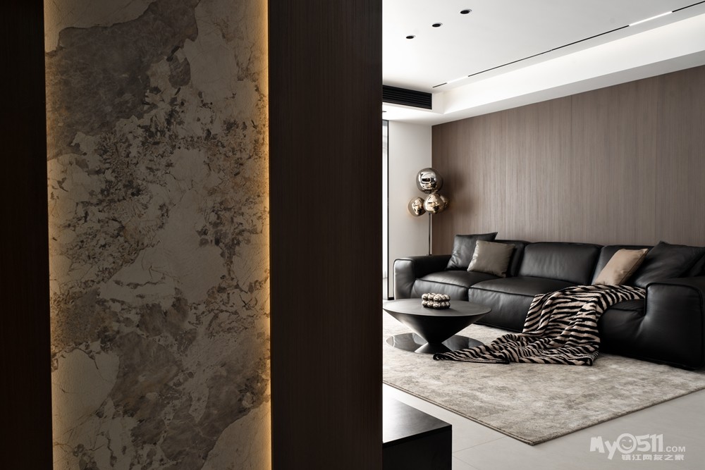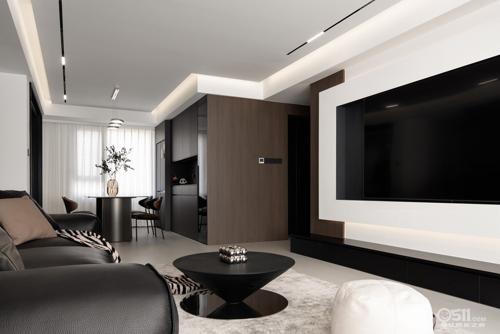 采用无主灯设计,通过筒灯、射灯、灯带等组合,营造出层次丰富的光影效果。地面通铺瓷砖,搭配简约的黑色皮质沙发,线条简洁流畅。电视背景墙运用石材、木饰面板等材质,打造出具有质感的空间。