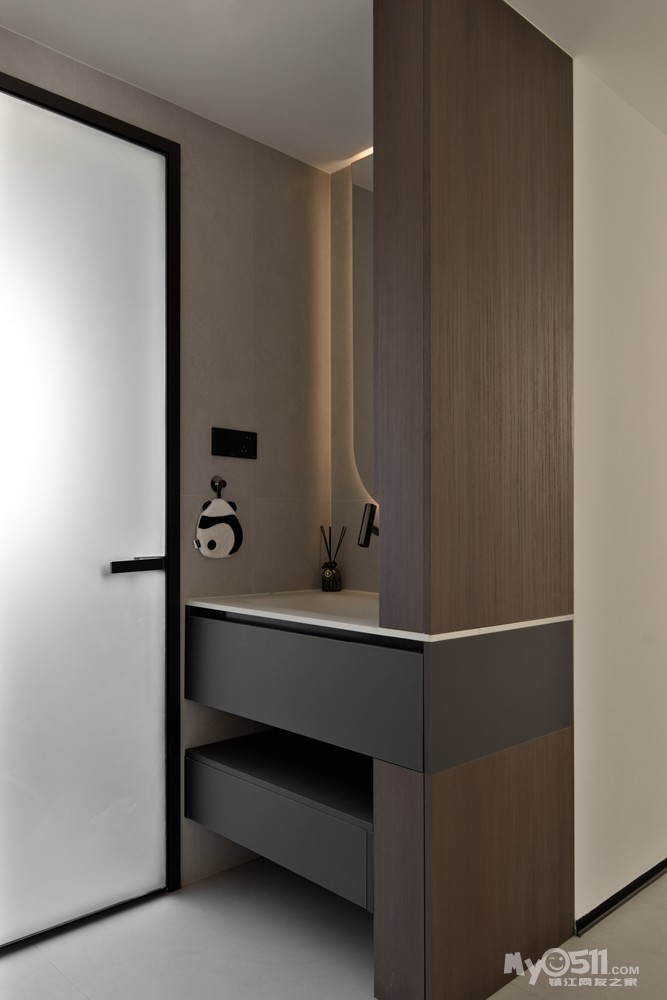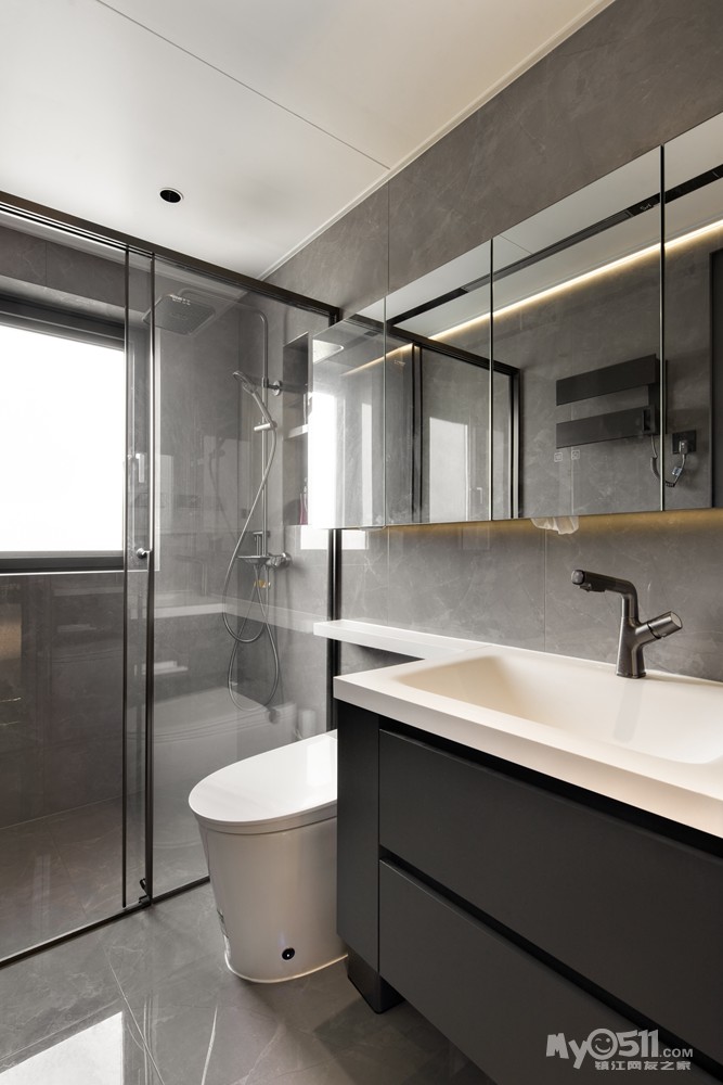 采用长虹玻璃移门,保证空间通透性。墙面和地砖采用同一色系,搭配简洁的浴室柜和马桶,镜柜的设计增加了收纳空间。