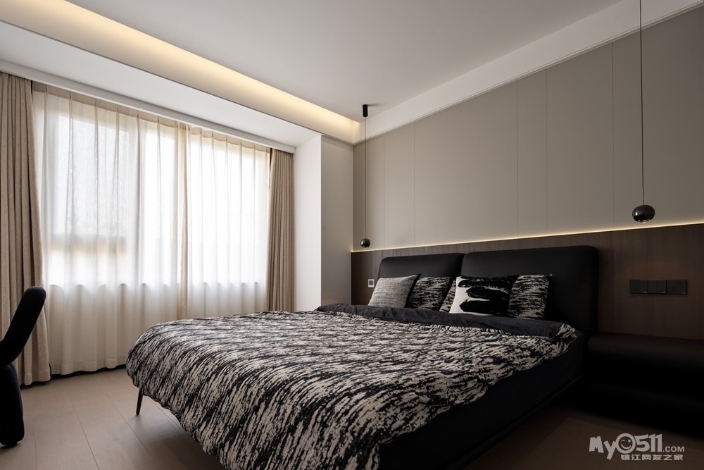 背景墙采用护墙板或拼接造型,搭配灯带,营造出温馨舒适的氛围。床品选择简约素雅的款式,与整体风格相协调。