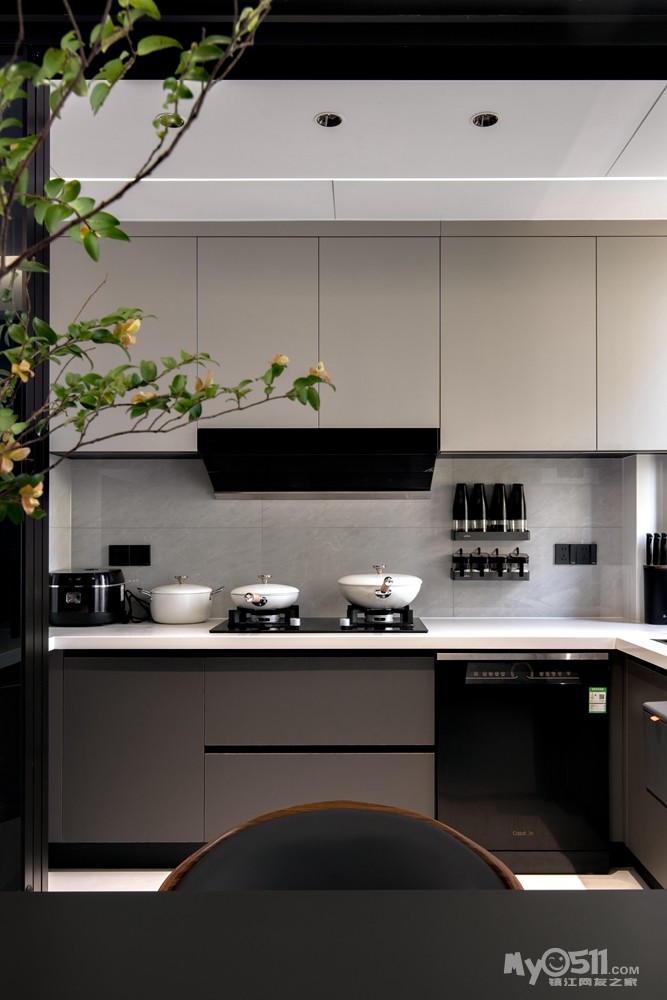 下柜以深棕色、上柜则以淡灰色为主色调,搭配跟客厅一样的浅色的地砖,简约又自然。橱柜设计为 U 型,增加操作台面和收纳空间,无拉手门板设计让厨房看起来更加简洁大方。