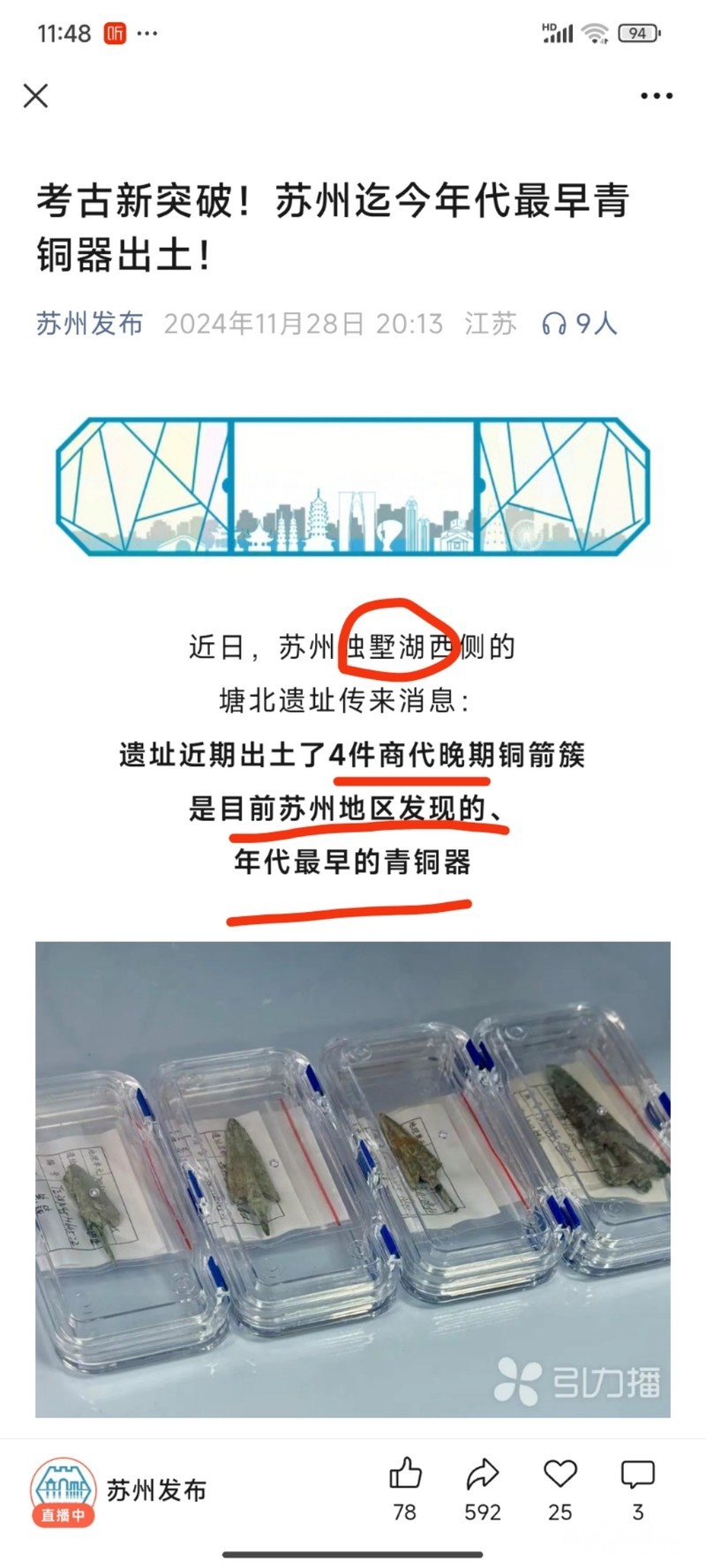 苏州历史可能被往前提千年以上。发现商代青铜器,位于寸土寸金的金鸡湖独墅湖畔 。