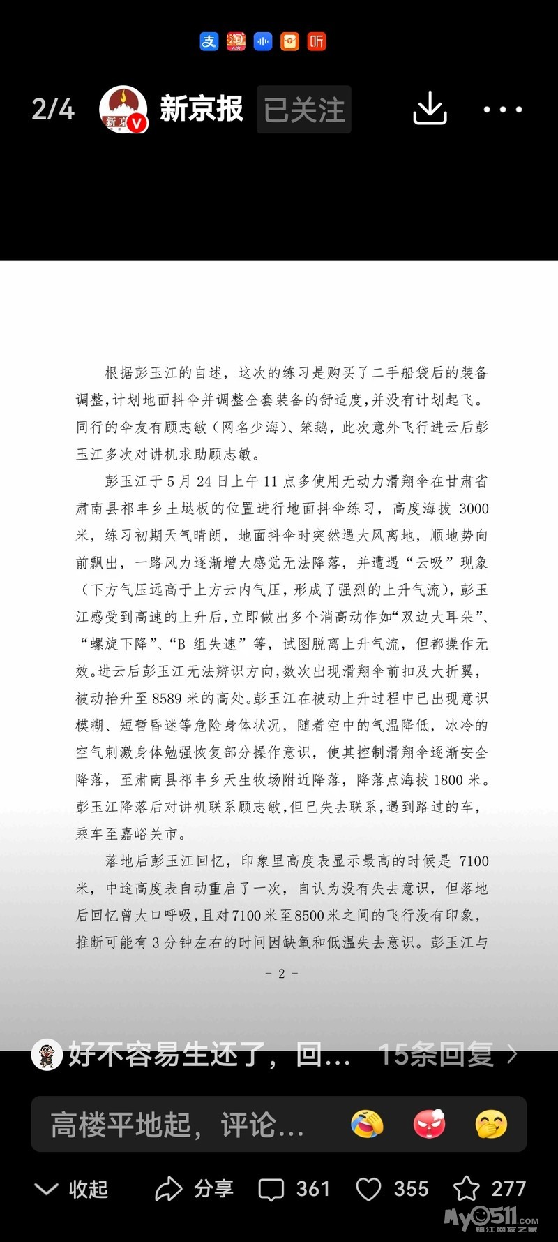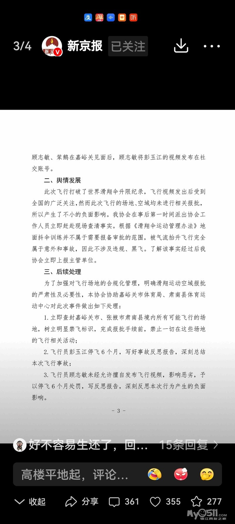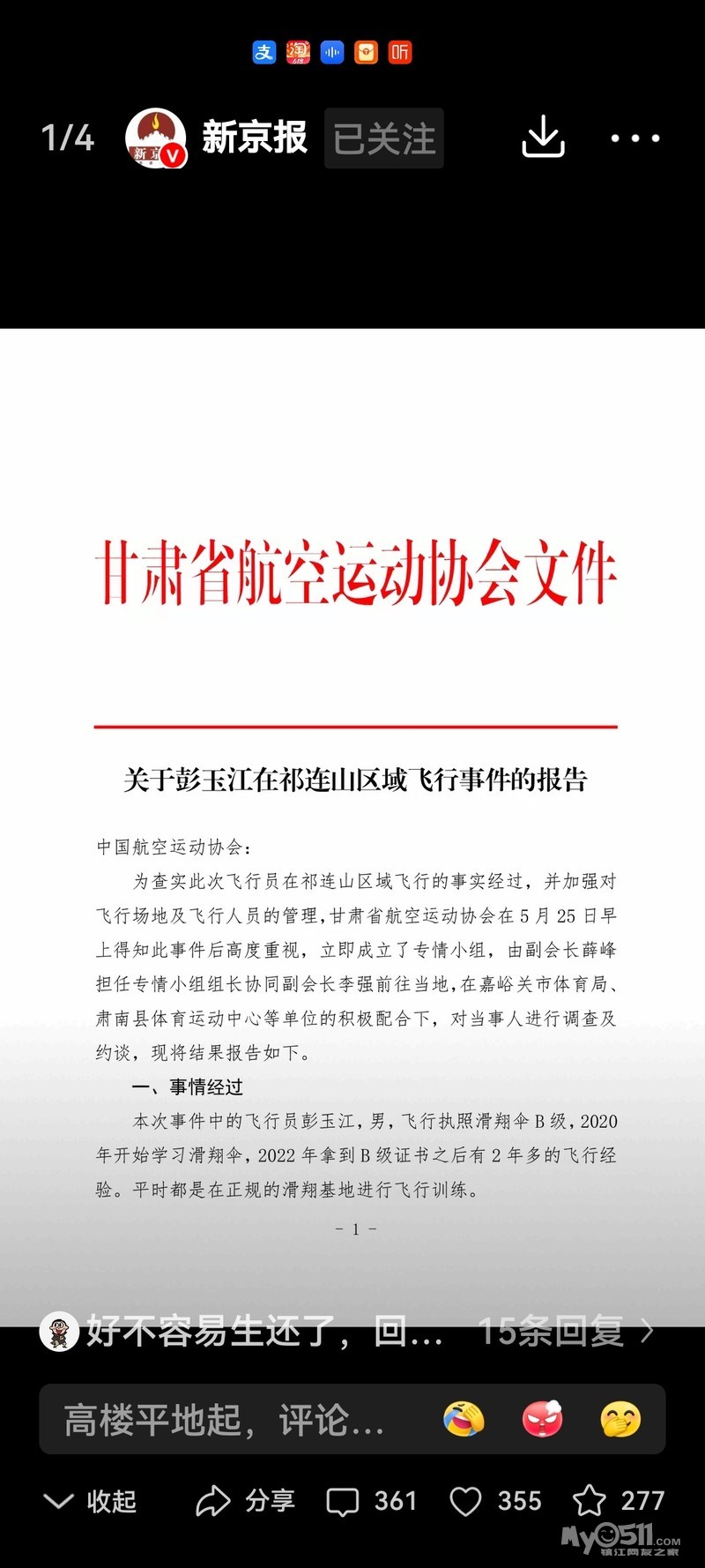 甘肃省航空运动协会发布关于彭玉江在祁连山区域飞行事件的报告