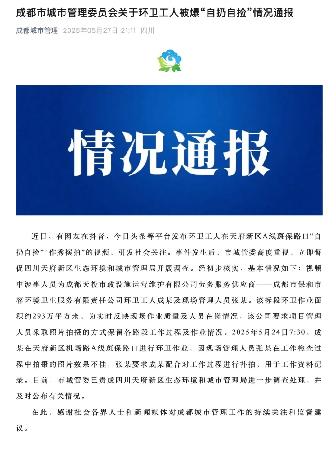 近日,有网友在抖音、今日头条等平台发布环卫工人在天府新区A线斑保路口“自扔自捡”“作秀摆拍”的视频,引发社会关注。事件发生后,市城管委高度重视,立即督促四川天府新区生态环境和城市管理局开展调查。经初步核实,基本情况如下:视频中涉事人员为成都天投市政设施运营维护有限公司劳务服务供应商——成都市保和市容环境卫生服务有限责任公司环卫工人成某及现场管理人员张某。该标段环卫作业面积约293万平方米,为实时反映现场作业质量及人员在岗情况,该公司要求项目管理人员采取照片拍摄的方式保留各路段工作过程及作业情况。2025年5月24日7:30,成某在天府新区机场路A线斑保路口进行环卫作业,因现场管理人员张某在工作检查过程中拍摄的照片效果不佳,张某要求成某配合对工作过程进行补拍,用于工作资料记录。目前,市城管委已责成四川天府新区生态环境和城市管理局进一步调查处理,并及时公布有关情况。