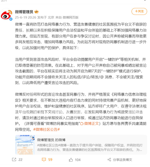 6月19日,微博发布公告称,站方发现,有部分用户在参与争议讨论时,因公开声称被网暴而导致更多网友相互攻击、增加网络暴力风险。为此站方将对现有防网暴机制进行进一步升级,以此加强对用户的保护,具体如下:当用户受到言语攻击风险时,平台会自动提醒用户开启“一键防护”等相关机制,并已取得显著的防范效果。在此基础上,对于用户公开声称自己被网暴或晒出被言论攻击截图的,平台在核实后将主动为其开启为期7天的“一键防护”模式进行保护,功能开启期间将不会接收未关注人的私信/评论/转发/@ 消息,不会被关注/搜索到,以此降低用户遭受言论攻击的风险。