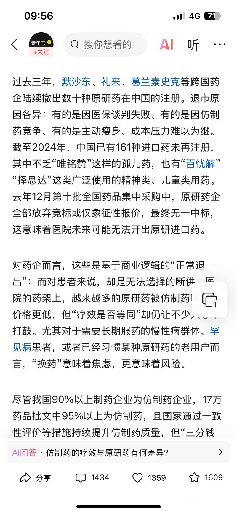 官方数据,公立二级医院集采药占比已经超过75%,三级医院集采药占比超过89%,进口原研药研发成本高,价格下不来,“生存空间”变小了,不得不撤出了。个人觉得这不是什么好事!