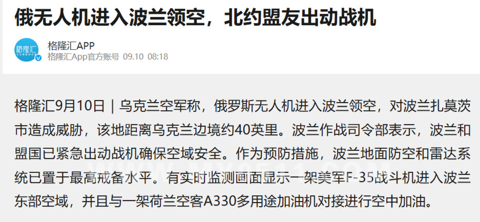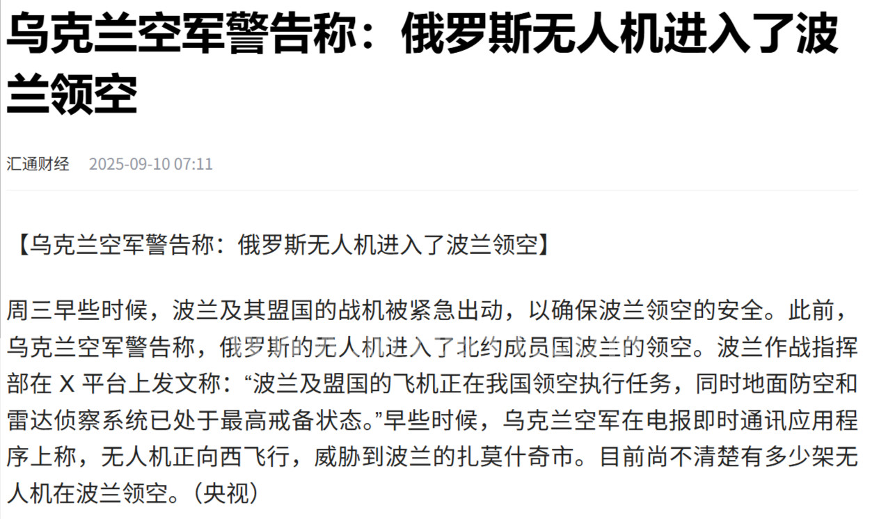 俄罗斯无人机越过波兰扎莫希奇附近的领空,促使北约紧急出动战机并提高防空警戒。