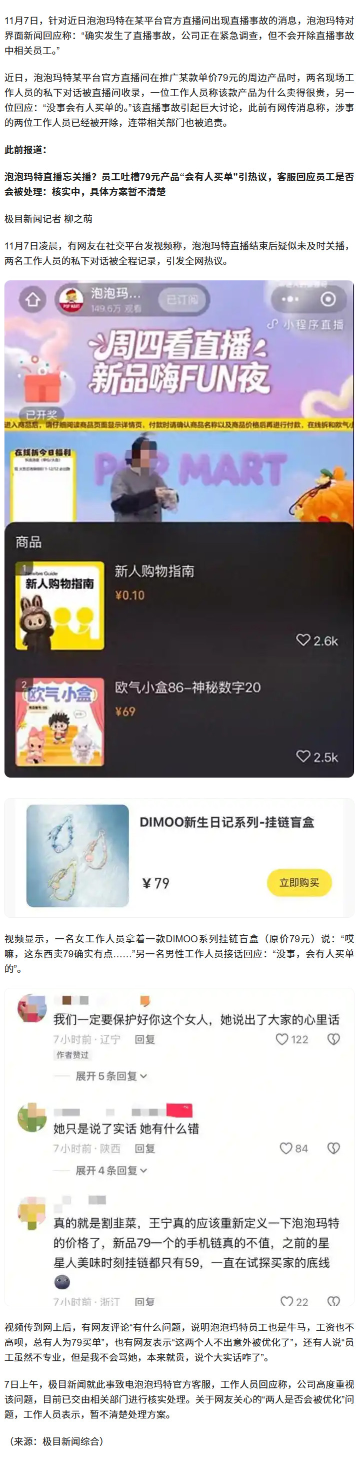 » 泡泡玛特回应直播忘关播事故:直播事故属实,正在紧急调查,不会开除涉事员工