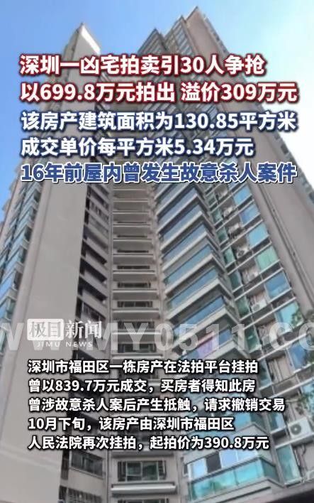 深圳一凶宅拍卖引30人争抢,以699.8万元拍出,溢价309万元,成交单价每平方米5.34万元