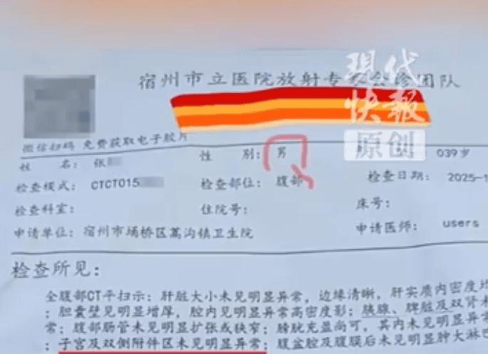 张先生的遭遇并不复杂:他在蒿沟镇卫生院拍完腹部CT,片子上传至宿州市立医院放射专家会诊团队审核,最终拿到的报告里,竟包含针对女性生殖系统的检查结论。