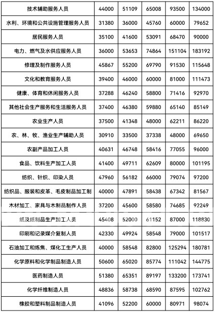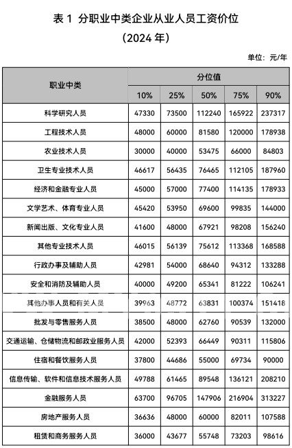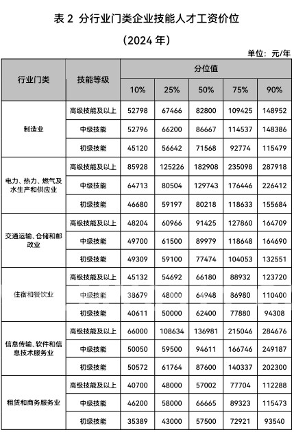 工资价位指企业从业人员在报告期内的工资水平,包括基本工资、奖金、津贴和补贴、加班加点工资和特殊情况下支付的工资等,它在一定程度上体现了劳动力市场价格水平。本次发布的企业从业人员工资价位主要包括不同职业从业人员工资价位、不同行业技能人才工资价位、部分数字职业从业人员工资价位,数据基于2024年度企业职工工资数据,采用加权方法处理,工资价位按10%、25%、50%、75%、90%等五个分位值发布。
