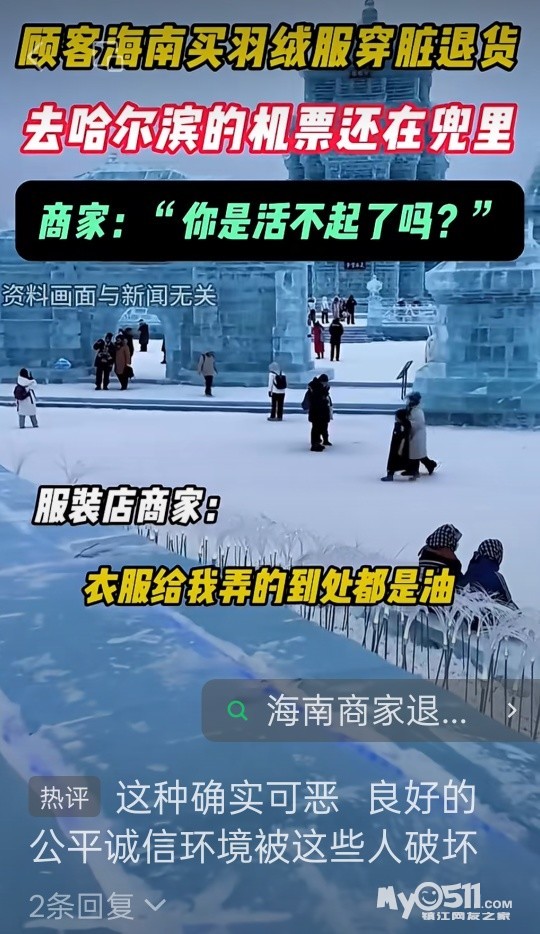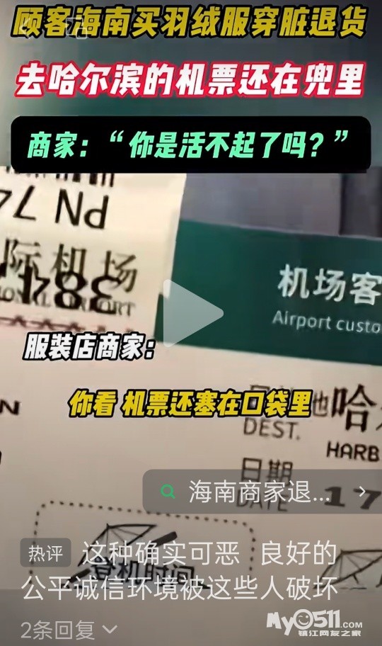 近日,海南。有商家发文称:有海南顾客在他家买羽绒服15天后,穿脏了退货,顾客去哈尔滨的机票还在口袋里。