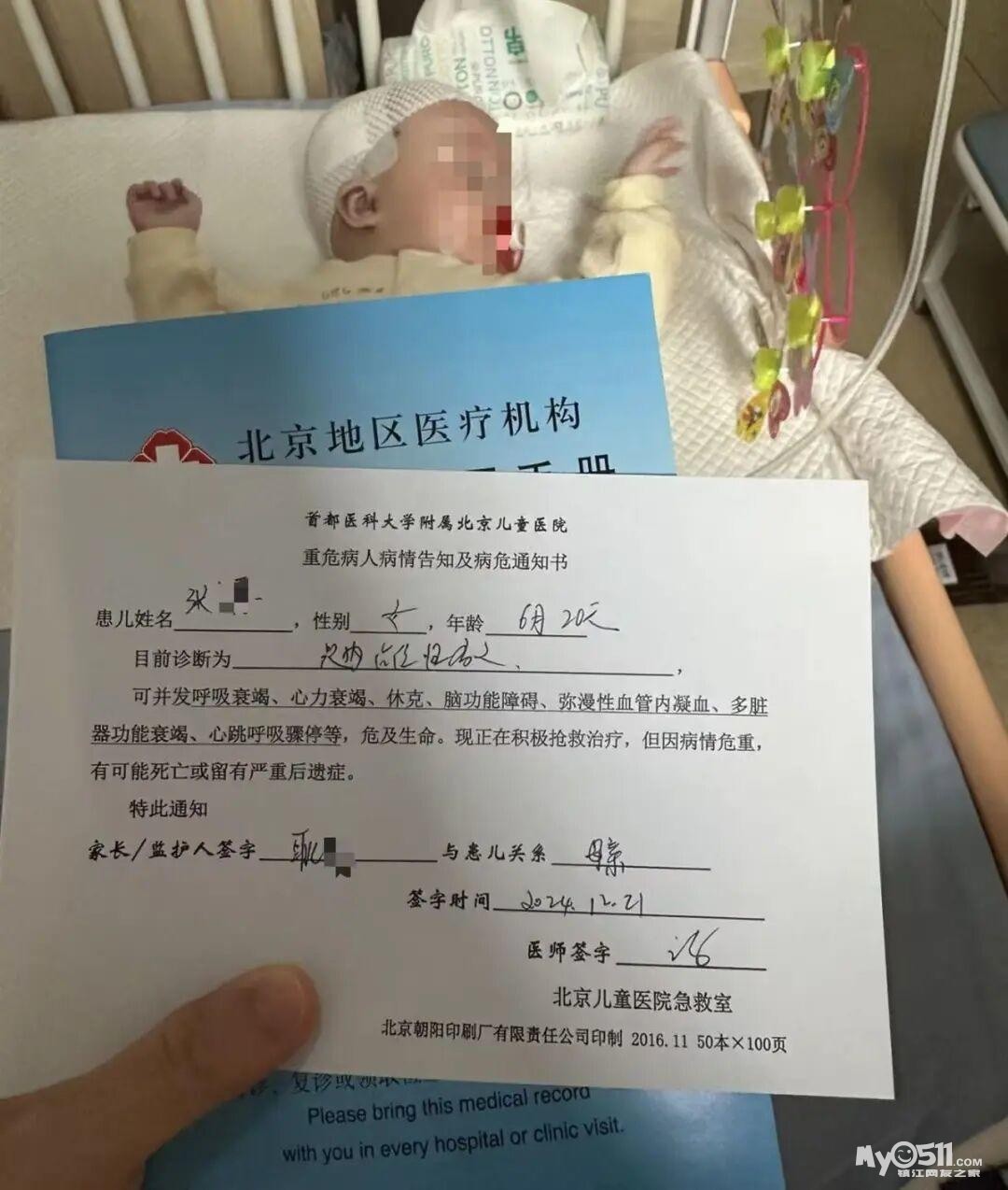 让耿女士没想到的是,2024年12月时她的小女儿被医院诊断出了小脑肿瘤,她赶紧将小女儿送到首都医科大学附属北京儿童医院治疗。据耿女士提供的首都医科大学附属北京儿童医院重危病人病情告知及病危通知书显示,她6个月大的女儿被诊断为颅内肿瘤,可并发呼吸衰竭、心力衰竭、休克、脑功能障碍、弥漫性血管内凝血、多脏器功能衰竭、心跳呼吸骤停等,危及生命,医师签字时间为2024年12月21日。由于医生明确告知称,病情危急,抢救希望不大,因此耿女士连夜将女儿转院到了复旦大学附属儿科医院。