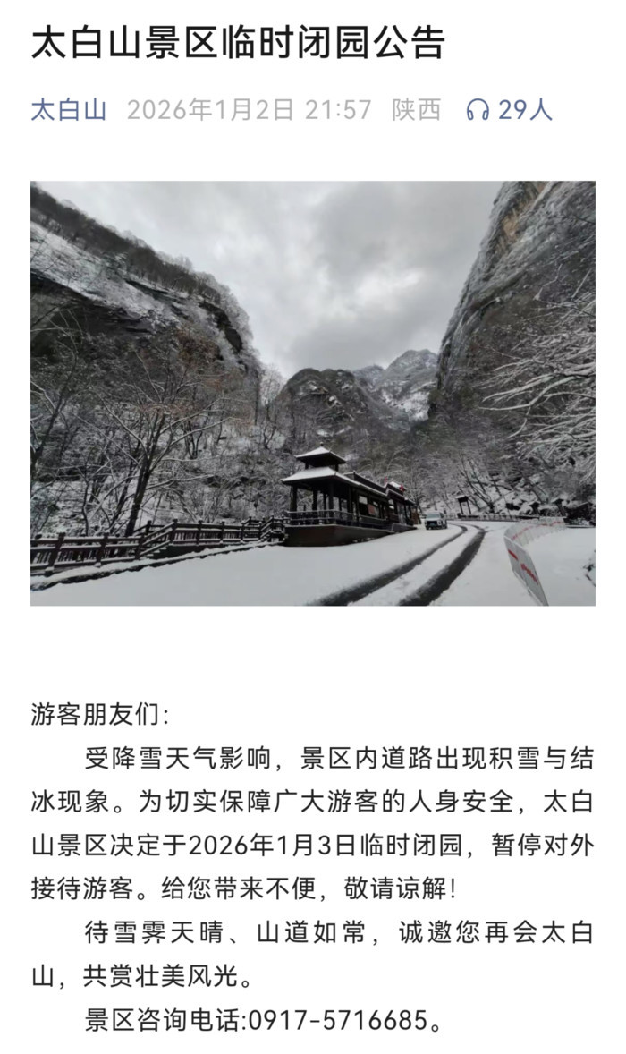 与此同时,太白山景区第一时间发布官方公告,明确表示为保障游客出行安全,景区决定于2026年1月3日临时闭园,暂停对外接待游客,闭园期间将对景区内道路、设施等进行全面排查与清理。