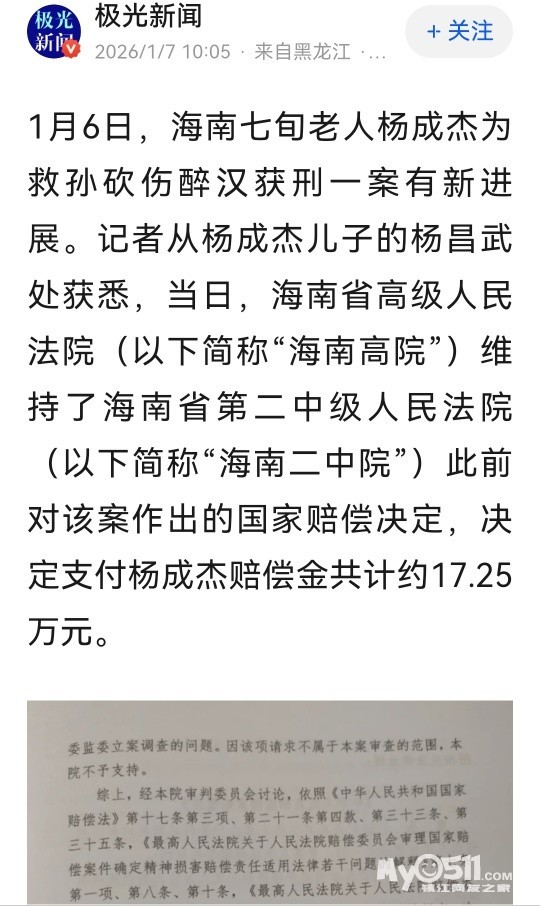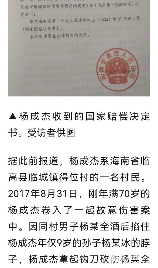 » 海南一老人为救孙子砍伤醉汉服刑8月,认定“正当防卫”后申请国赔,法院:赔偿17万