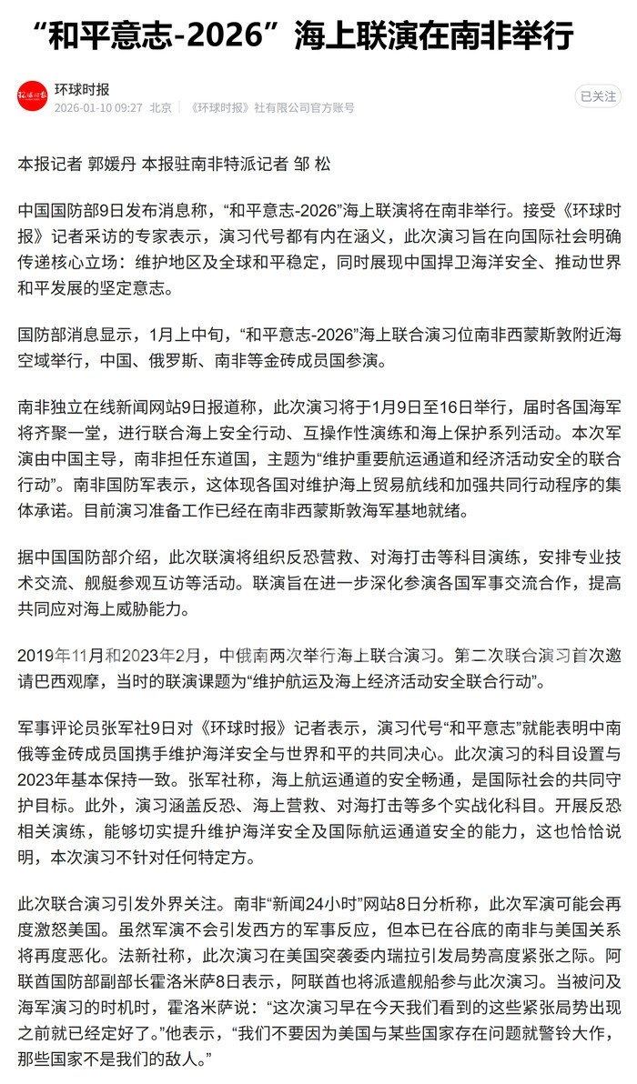 “和平意志-2026”海上联演在南非举行