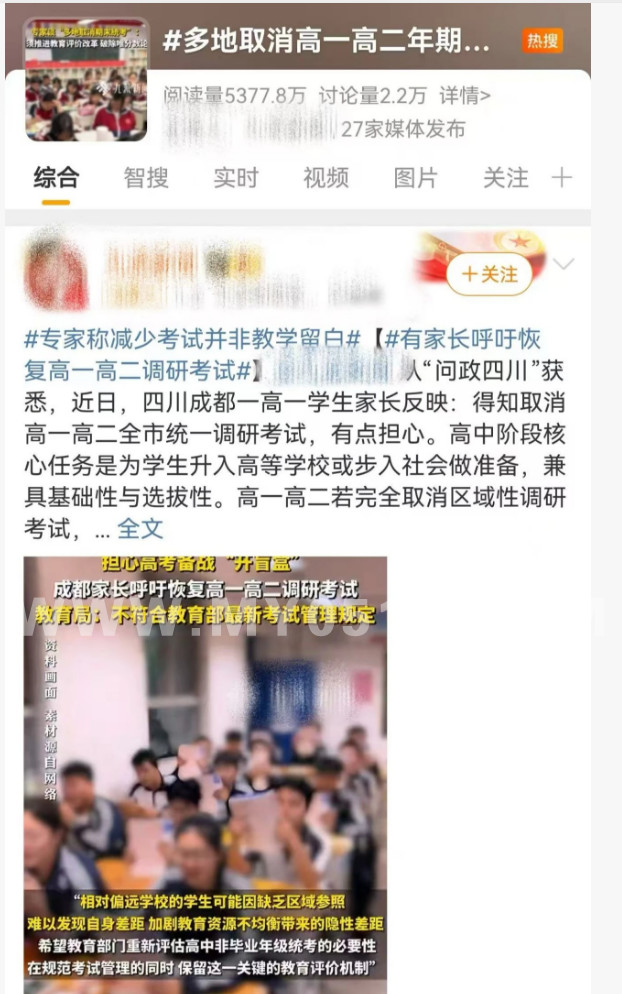 “多地取消高一高二期末统考”话题随后冲上热搜。
