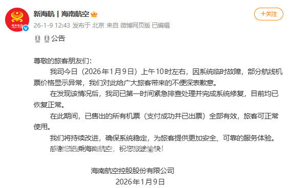 1月9日,针对部分航线机票价格异常问题,海南航空发布公告表示,公司系统临时故障期间出售的所有机票(支付成功并已出票)全部有效,旅客可正常使用。