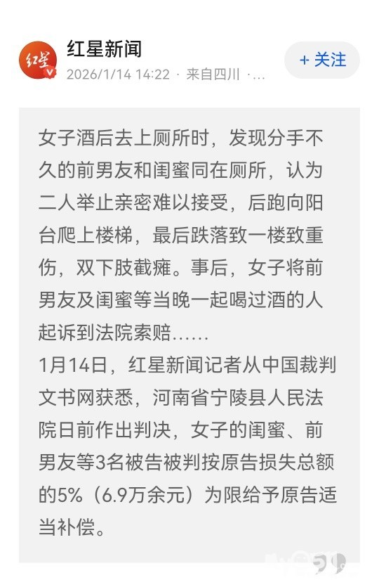 » 女子醉酒后见前男友和闺蜜同在厕所难以接受,坠楼致截瘫起诉多方索赔 ,判了