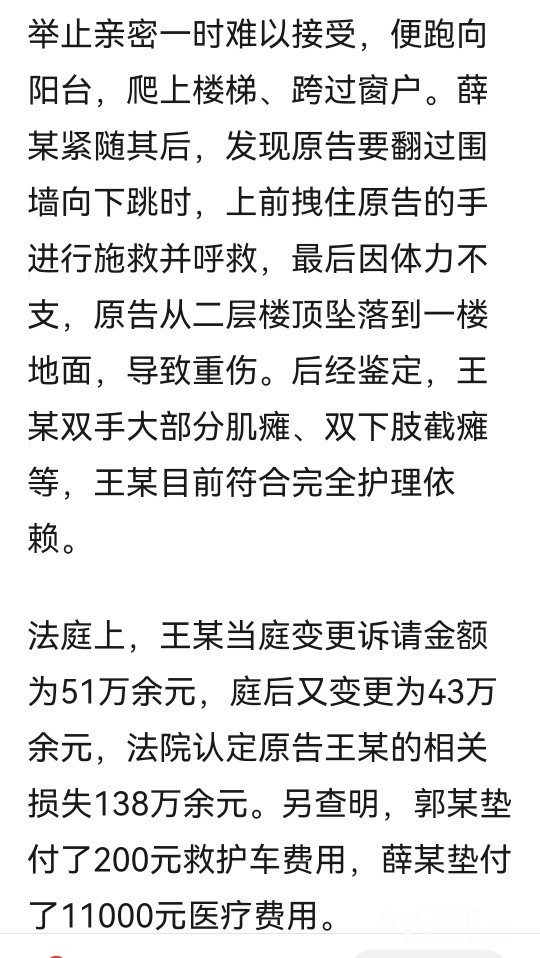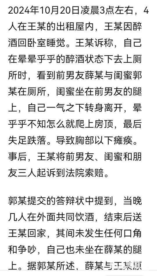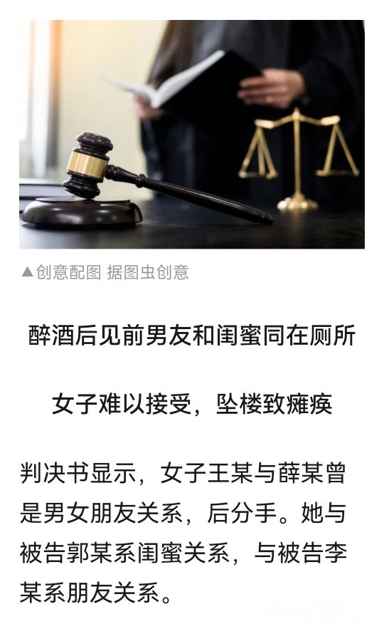 女子醉酒后见前男友和闺蜜同在厕所难以接受,坠楼致截瘫起诉多方索赔 ,判了