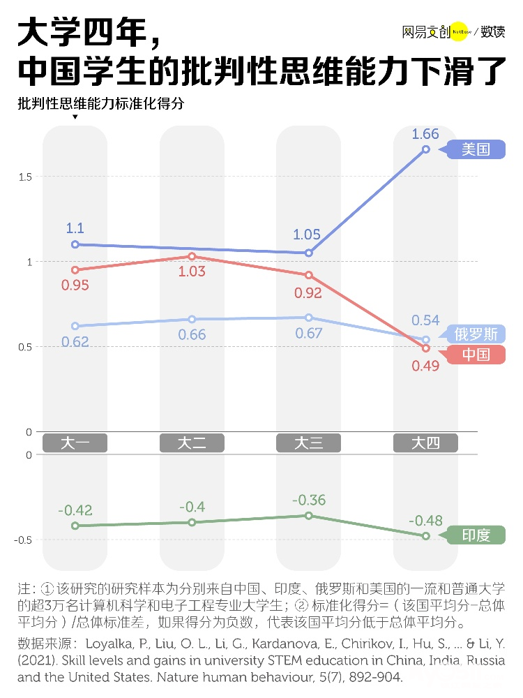 这项研究抽样统计了美国、俄罗斯、印度、中国四国超过 3 万名计算机科学和电子工程专业学生,测量他们的批判性思维、数学和物理能力。结果显示,经过大学四年,中国大学生的三项能力通通下滑了。