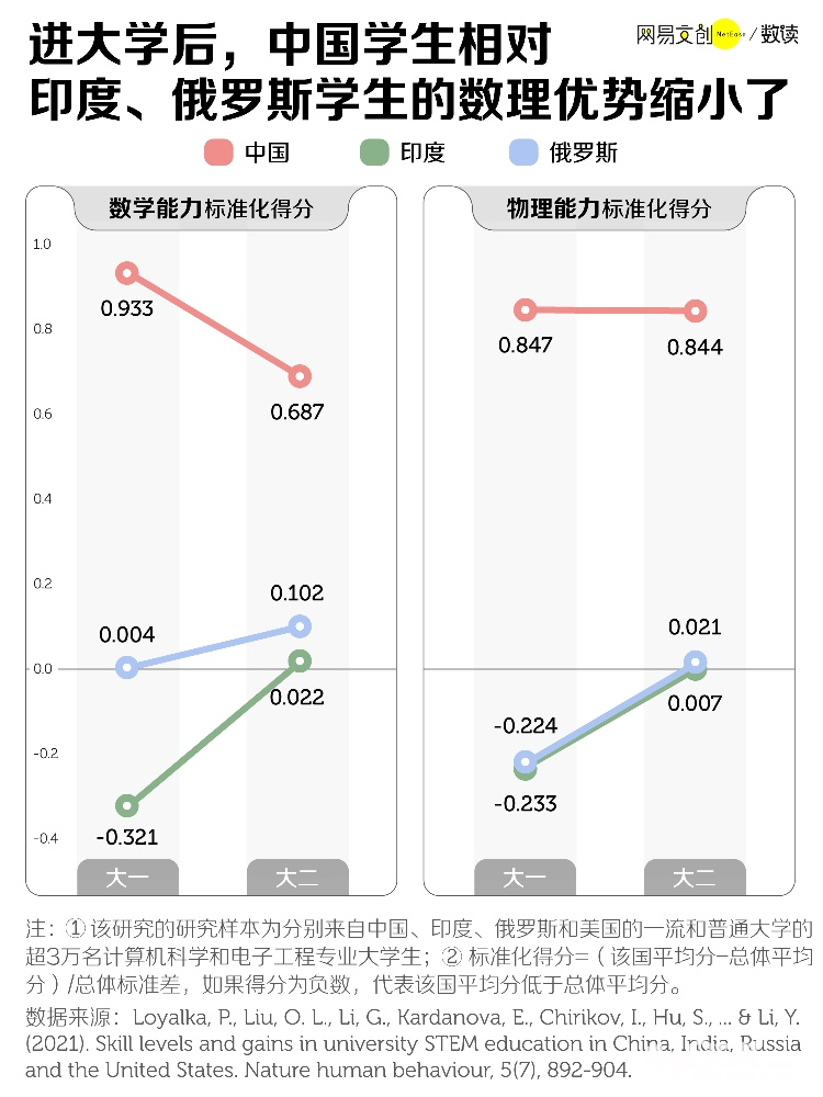 从得分来看,从大一到大四,中国大学生的批判性思维能力几乎腰斩,而美国学生上涨了 50.9%。在数学、物理能力上,和印度、俄罗斯相比,中国大学生大一遥遥领先,但到了大二,前者得分明显上涨,中国学生反而退步。