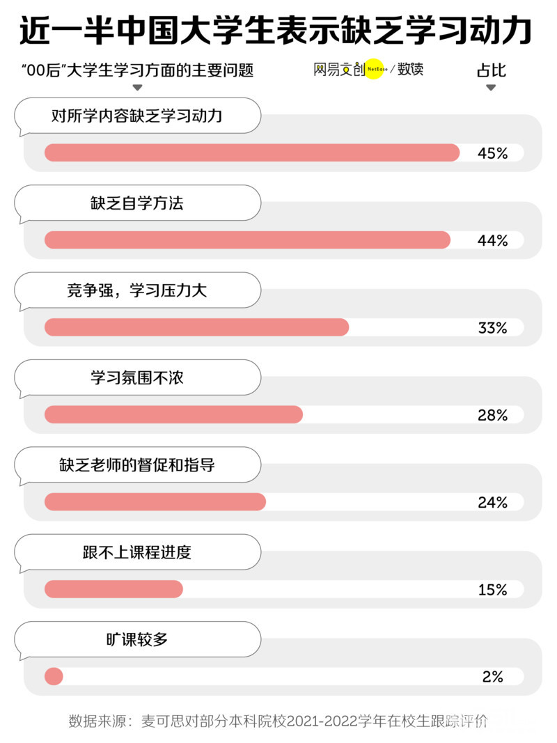 此外,大学生们还普遍缺乏学习动力。熬过了高压的高中,很多人一下陷入了“不知道为什么学”的迷茫。麦可思研究发现,有 85% 的“00 后”大学生都遇到了学习问题,其中近一半的人表示缺乏学习动力,大一、大二学生更是如此。