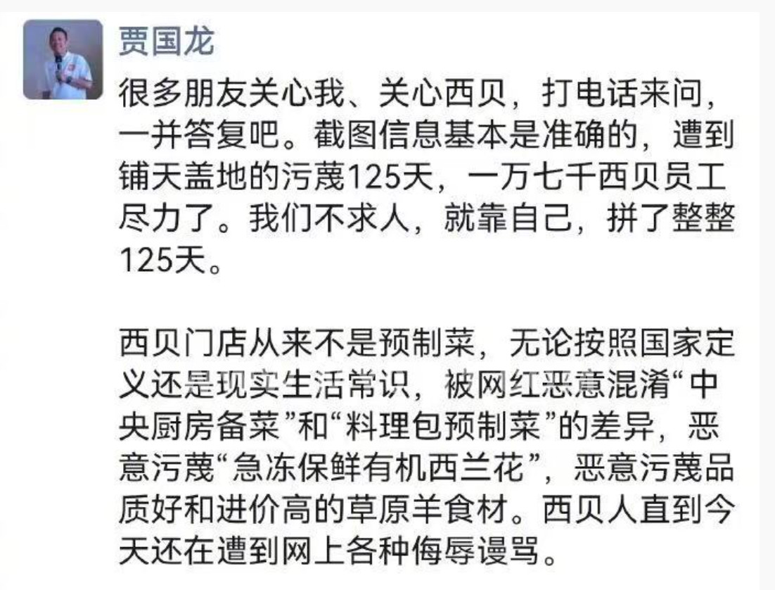 西贝将关闭全国102家门店,贾国龙:遭污蔑125天,不是预制菜,被网红恶意混淆和污蔑