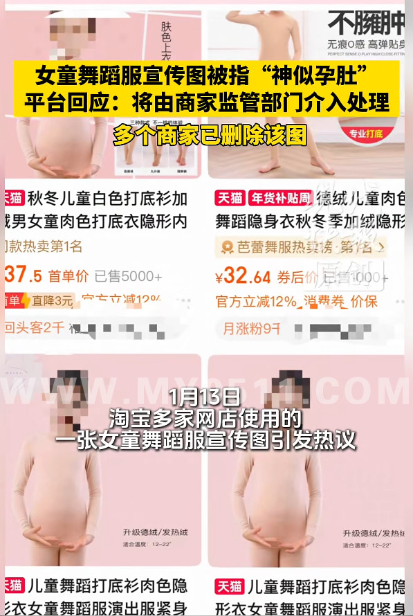 1月14日,现代快报记者向淘宝平台进行反馈,工作人员回应称,已记录下问题,将由商家监管部门介入处理。15日,记者看到,多家店铺已经将该商品宣传图删除,有商家直接下架了产品。现代快报记者搜索发现,这张照片被多家商家用于女童“肉色打底衣”“舞蹈服”“隐形衣”“紧身上衣”相关的商品宣传。照片中,女童穿着肉色服装,背景图与服装颜色相似,手部放在腹部以下,腹部加重了阴影,给人产生捧着肚子的感觉。记者对比发现,其他同类商品宣传图,衣服上几乎没有阴影,模特的手部动作也比较自然。