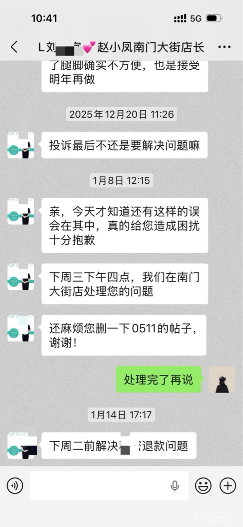 上次发帖之后,1月8号去找他们门店处理,8号当天在警察面前说好的 约了1月14号下午4点到南门大街店解决,14号当天他们店长还有一个李顾问,当天协商 答应了1月20号星期二之前处理我的退款 没开卡的全部退,开卡了的扣减部分退款 也签字了,出于相信他们,14号协商当天没拿到退款 答应我退 我就走了。结果到了20号那天钱也没退给我,还提各种要求。今天22号来找他们南门大街店,店长说的只能退一个项目,其他的退不了,我肯定不能答应,本来就是赵小凤诈骗消费者在先,一而再再而三的欺骗拖延,现在直接躲起来不处理了。