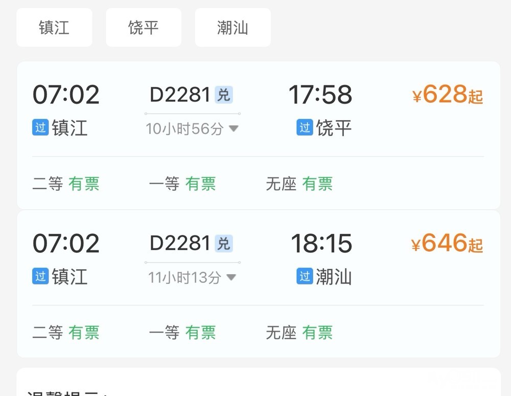 镇江没有直达潮洲和汕头的火车吗?