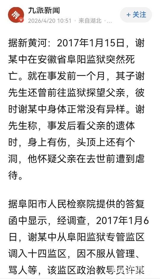 安徽一服刑人员遭虐待身亡,家属称遗体身上有伤,头顶有洞,涉事狱警一审获刑8个月