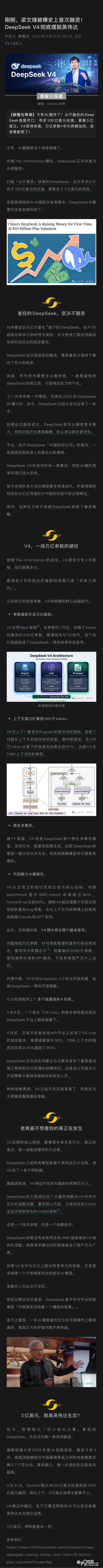 » 刚刚,梁文锋被曝史上首次融资!DeepSeek V4彻底摆脱英伟达