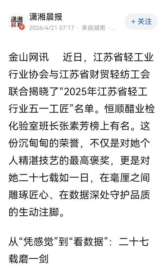 » 执数据之尺,量百年醇香——记“2025年江苏省轻工行业五一工匠”恒顺张素芳