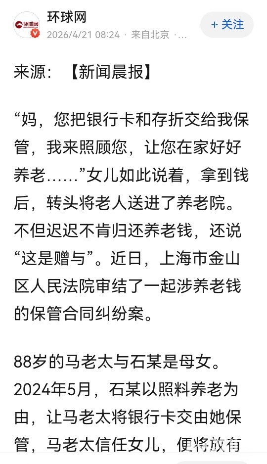 » “妈,我来照顾您!”上海一女儿拿走母亲121万,转头把她送进养老院!法院判了