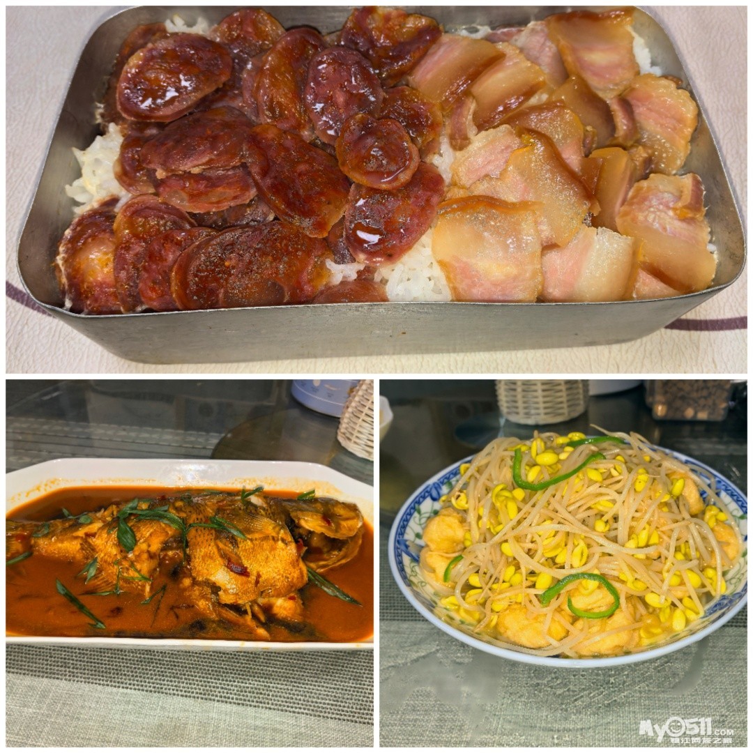 老式铝饭盒咸肉腊肠蒸饭,红烧鲈鱼,豆芽炒豆泡,一个人简简单单的一餐
